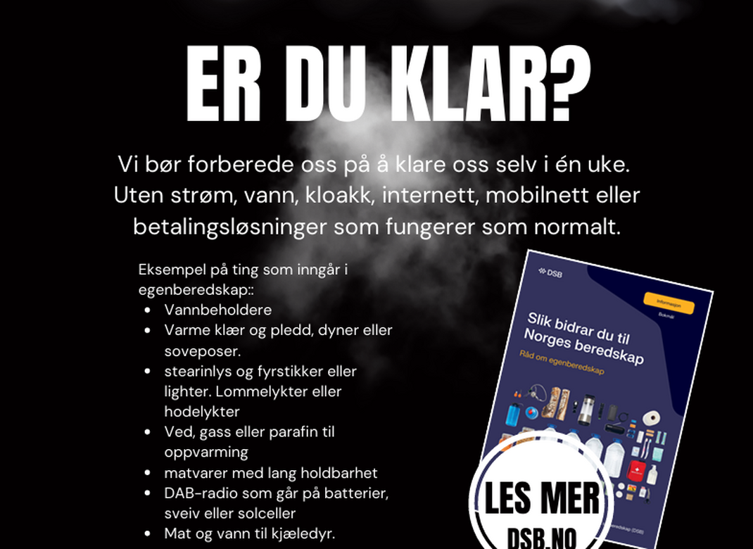 - Informasjon: DAB-radio med batteri/sveiv, powerbank, viktige telefonnumre på papir.